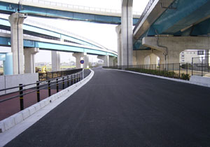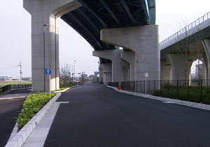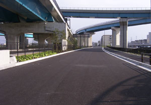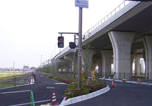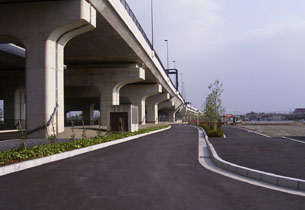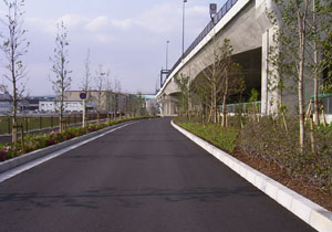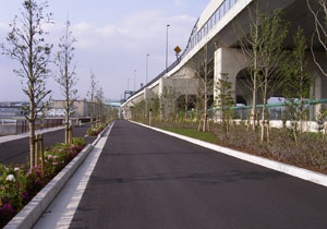 高速道路下での植栽工事の為、出来るだけ高速道路のピアが見えないように樹木を配置。又、野鳥のよりどころとなるように、落葉及び常緑の樹木を配置し、緑を一年を通して絶え間なく提供できるよう考え施工。