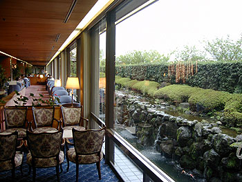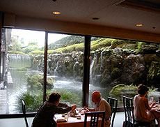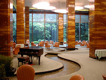 1階のロビーから地下のレストランへ流れを通して、長い滝が落とされています。