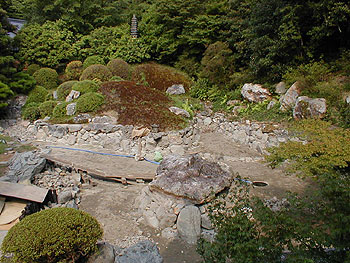 京都東山にある粟田御所と呼ばれ天台宗の格式高い門跡寺院で庭園は江戸時代の作とされています。ちょうど池の改修工事の為、池の水を抜いているので、石組みの様子がよくわかります。